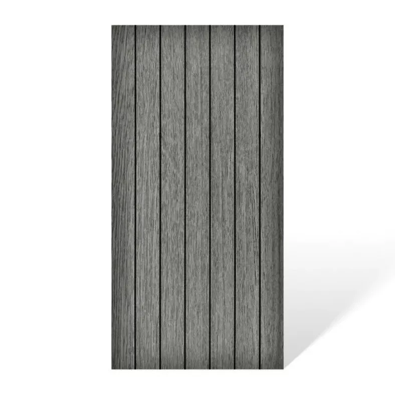 Valósághű fa hatású, sötétszürke lambéria mintás öntapadós dekorpanel, 3D-s bordázott felülettel és a deszkák közötti finom mélyedésekkel fekete színnel.