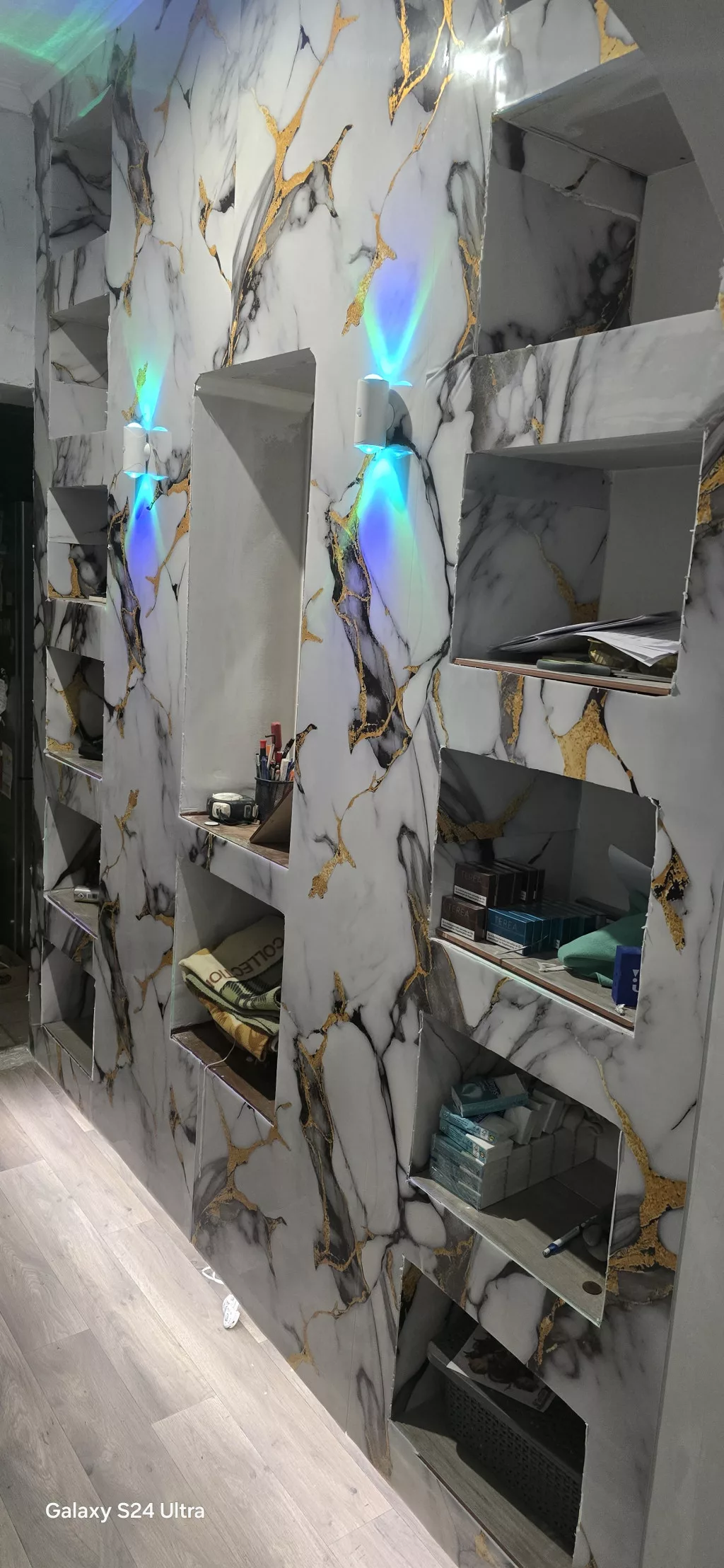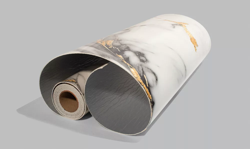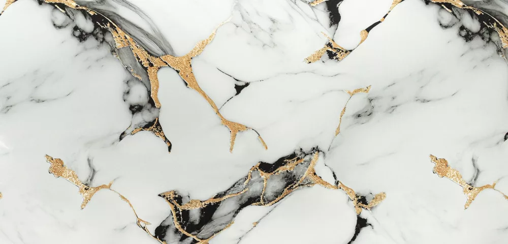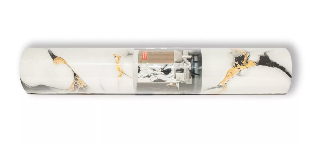 Márvány mintás öntapadós falpanel, szürkésfehér alapon, fekete és sárgás mintával.